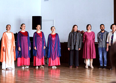Kauno Valdorfo mokyklos mokytojai svečius pasitiko giesme „Salvator mundi salva nos“, euritmijos mokytojų pasirodymus lydėjo nuostabi klasikinė muzika bei kalbos formavimo mokytojų deklamuojami eilėraščiai.